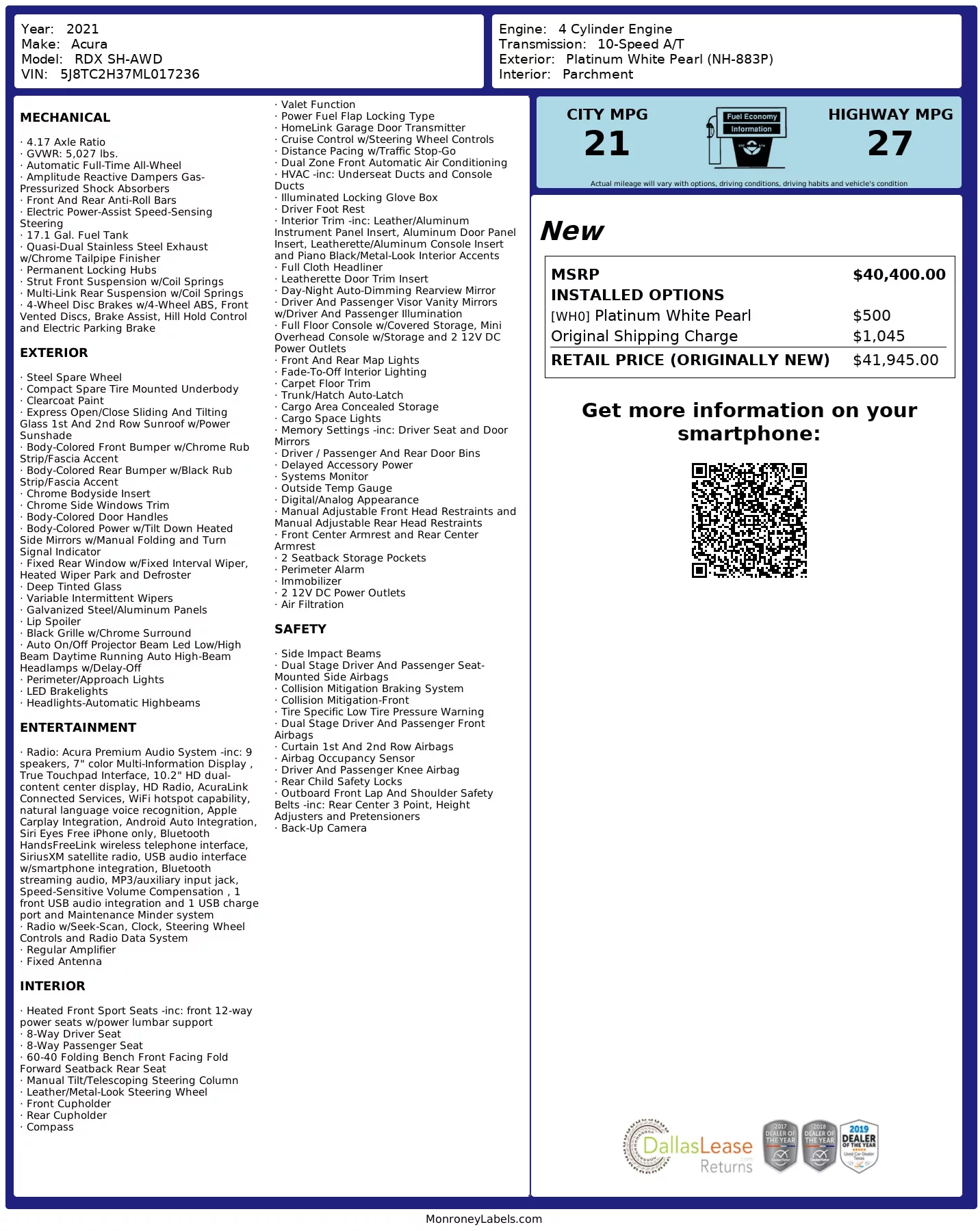 This 2021 Acura RDX combines sharp styling with sophisticated performance. Finished in Platinum White Pearl over a luxurious Tan interior, it’s equipped with Acura’s renowned Super Handling All-Wheel Drive (SH-AWD) and a powerful 2.0L Turbo engine, making it both a practical and thrilling daily driver.